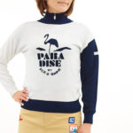 ワイルドなカモフラ柄にボーダーを重ねることで、軽やかさとスポーティさを演出。coolで個性的な一枚に仕上がっています。胸元にはbigエンブレム、襟裏にはメッセージプリントを忍ばせ、立て襟スタイルに遊びゴコロをプラス!