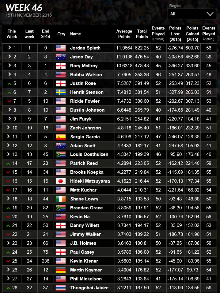 最新のマネーランキングが更新されました。松山選手は先週の12位から15位に後退!