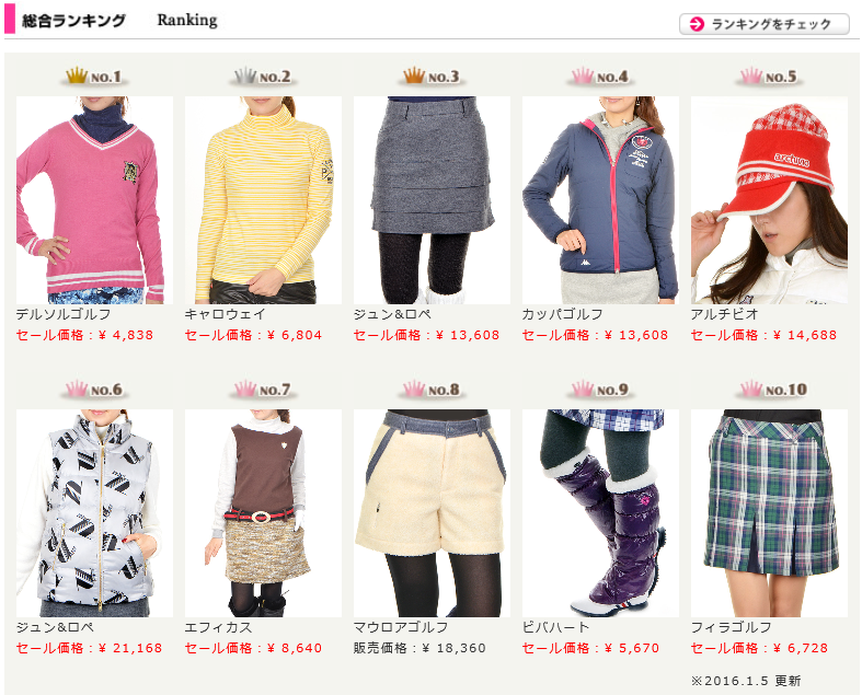 人気の高かった商品をアイテム別にランキング!みなさんが支持するトレンドアイテムが一目でチェックできます!トップス、ワンピース、スカート、アウター、パンツ、ハット・サンバイザー、グローブ、ゴルフアクセサリー、ファッション・小物、ソックス・レギンス、バッグなどそれぞれのカテゴリーで売れ筋ランキングを紹介しています。