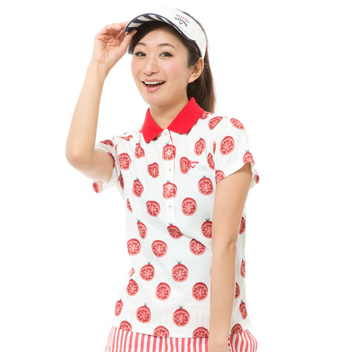 太陽が似合う、元気いっぱいのトマト柄を全面にあしらったボタンシャツは、ホワイト、ネイビー、グリーン、レッドの4色展開。程よく体にフィットし、速乾性にも優れているので、ストレスなくプレーを楽しめます。それでいて襟付きなので、大人な雰囲気もキープします。