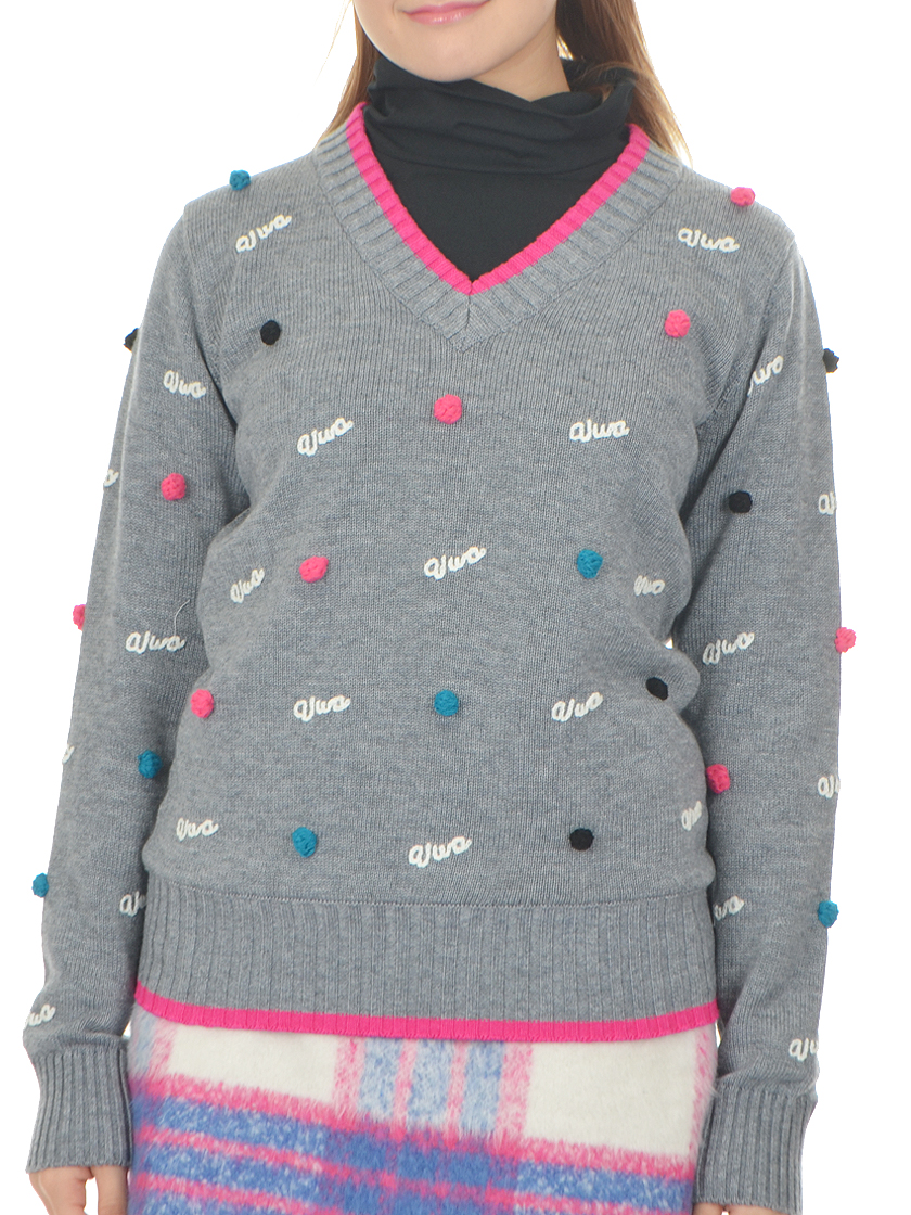 ボンボンと刺繍がとってもキュート。Vネックなのでシャツをインしてトラッドテイストに仕上げても◎。インパクトのあるデザインでコーディネートの主役に。