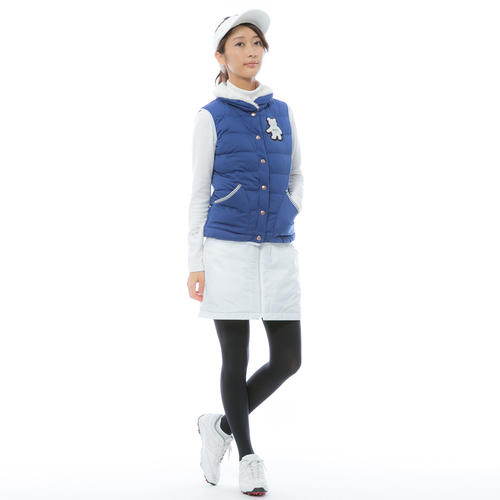 オリジナルテキスタイル採用の総柄プリントスカートは、冷える秋冬のゴルフ場でも暖かく身を守ってくれる中綿入り。左裾部分に配された、くまちゃんワッペンがキュートな1着です。同柄のジャケットと合わせてもオシャレ度高し! 防風・撥水加工付き。