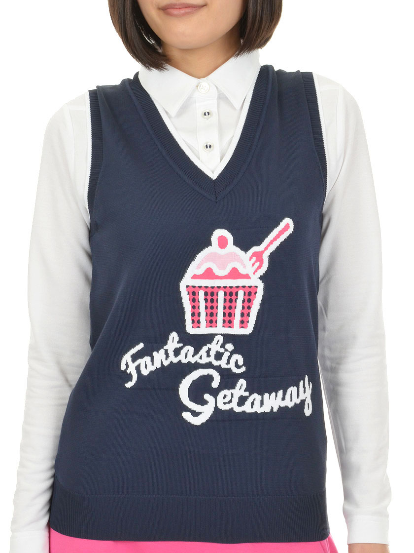 目を引くカップケーキがデザインされたVネックベスト。Vラインや袖部分はカラー違いの縁取りですっきりと見せてくれます。吸水速乾機能付きでベタつく季節のラウンド時にもおすすめ。薄手でさらりとした生地で重ね着してモコモコしません。同じシリーズのポロシャツやボールポーチも展開しています。