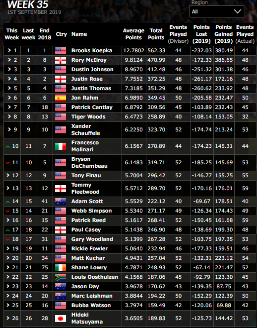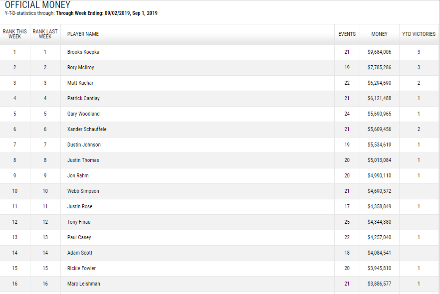 松山英樹の最新ランキング(2019/9/2現在) 投稿日: 2019年9月5日 から golf-net.jp フェデックスランキング(2019/9/2現在) 最新の2018-2019年度のFEDEX(フェデックス)ランキングが更新されました。松山英樹選手は15位から9位Tにランクアップ。 フェデックスランキングをみる↓ マネーランキング(2019/9/2現在) 最新のマネーランキングが更新され松山英樹選手は先週の23位から変動なし。 最新のマネーランキング詳細をみる↓ 世界ランキング(2019/9/2現在) 最新の世界ランキングが更新されました。松山選手は先週の26位から変動なし。 最新の世界ランキングの詳細をみる↓