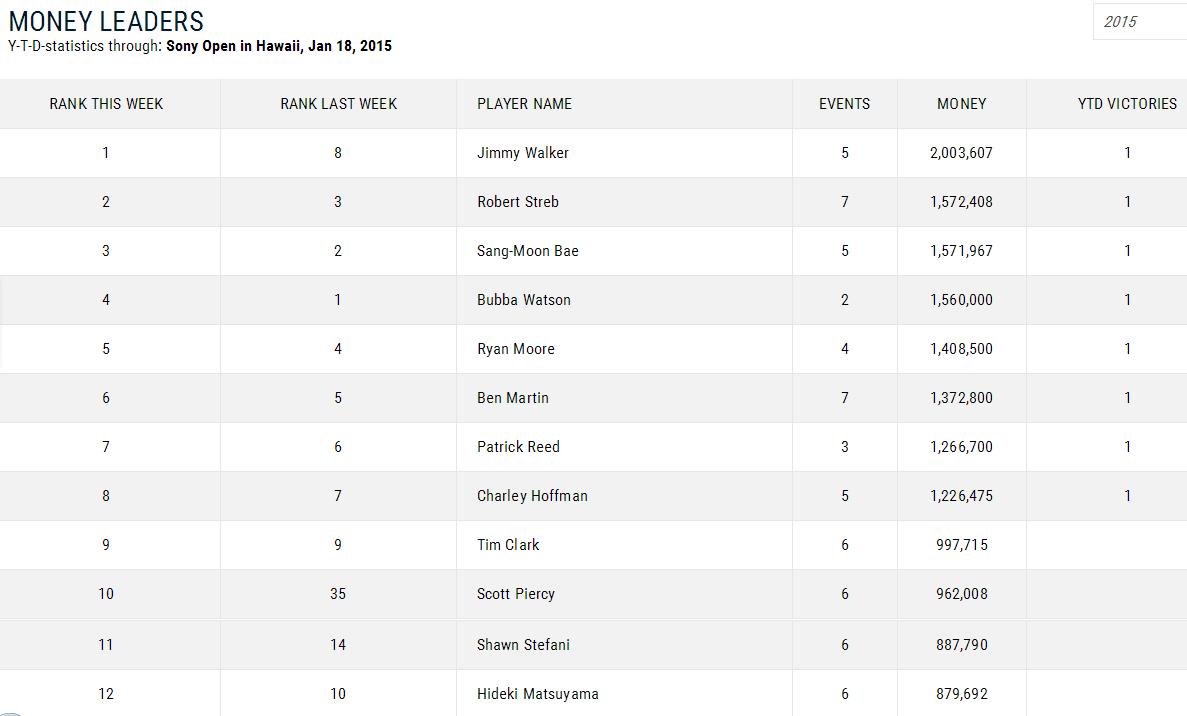 2014-2015年度のPGAツアーランキングが毎週更新されて随時発表しています♪先日ハワイで惜しくも優勝をのがした松山英樹選手でしたがソニーオープンにて最終日に残れなかったのが原因で18位に落ちています。