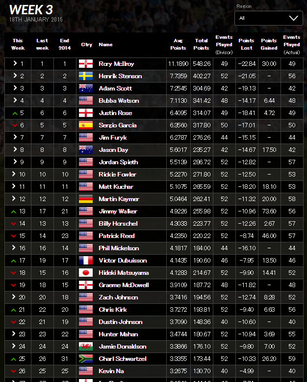 ランキングトップは先週から変わらずロリー・マキロイ選手です。彼は先日のアブダビHSBC選手権の2日目に自身プロ初のエース(ホールインワン)を達成して同組で一緒にラウンドしていたリッキー・ファウラー選手とガッチリ握手!ファウラー選手とはプライベートで一緒にラウンドする仲といいます。