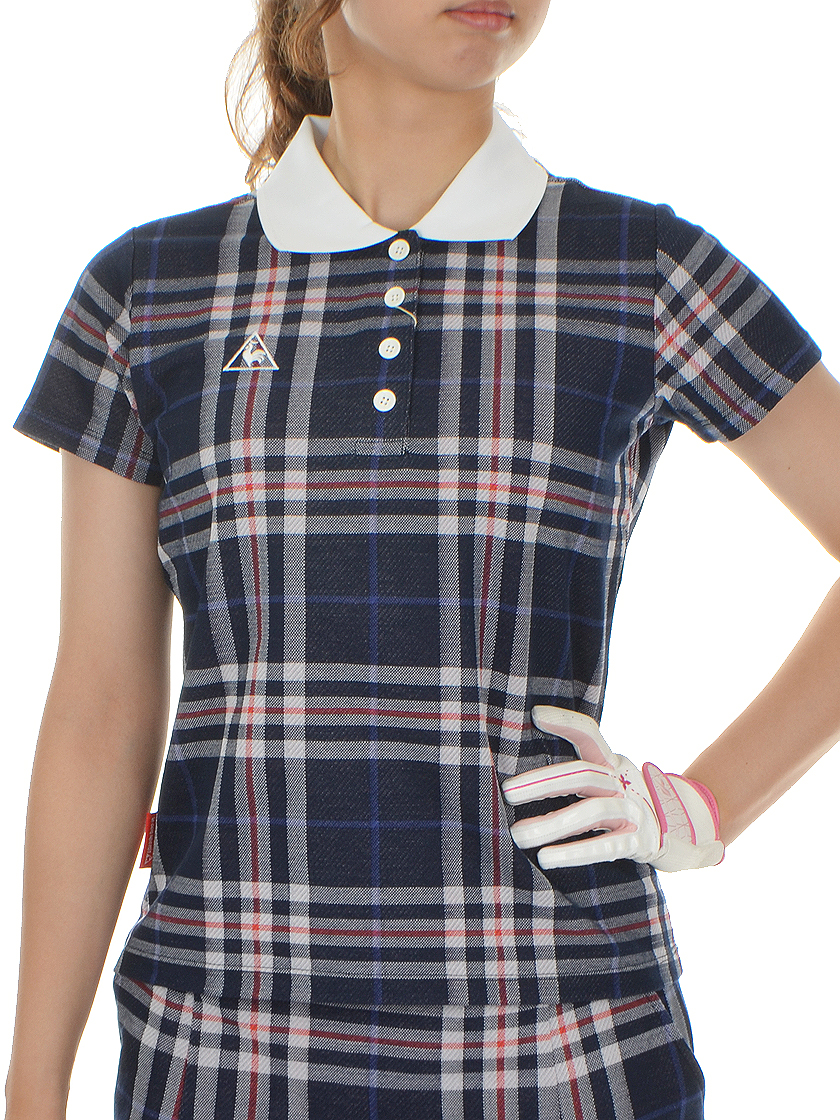 バックのロゴがさりげなくポイントに。吸汗速乾、UVケアと高機能素材を採用しているので快適にプレーできます。同柄のスカートも展開中、セットアップでワンピース風にも♪