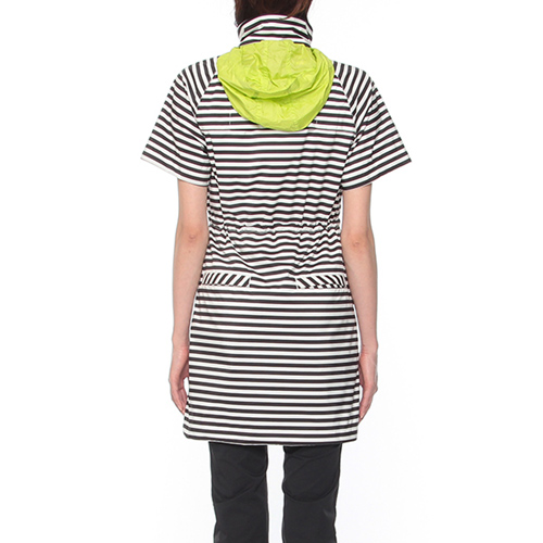 カジュアルな印象のボーダー柄レインウェア。前立て裏の配色がアクセントになっています。ウエストのドローコードでフォルムの調節も可能。フードはポケッタブルタイプです。袖は取り外せ半袖でも使える2WAY仕様。この1着があれば急な雨にも安心です。