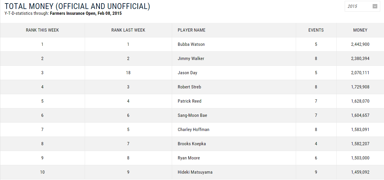 PGA賞金ランキング(2015/02/09現在)